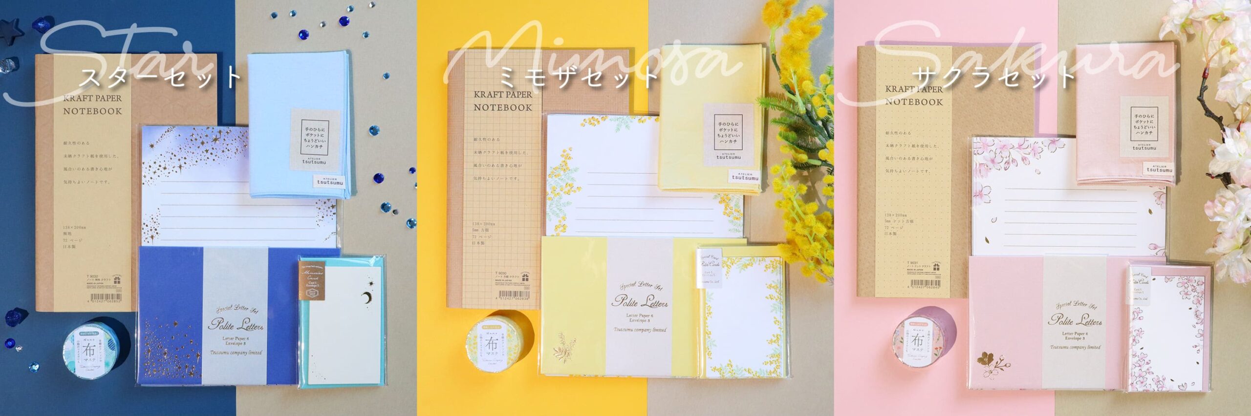画像左から「スターセット」「ミモザセット」「サクラセット」のうちいずれか