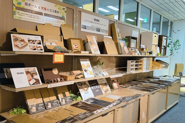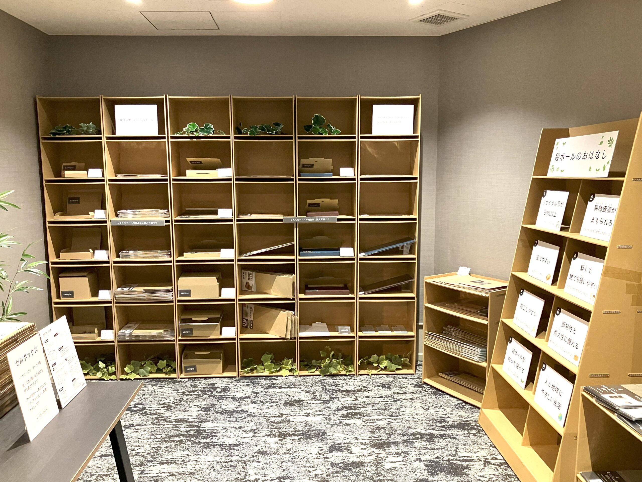 新たなオフィスでサステナブルなダンボール棚を使用した展示と、初めての食品商品試食を行いました。