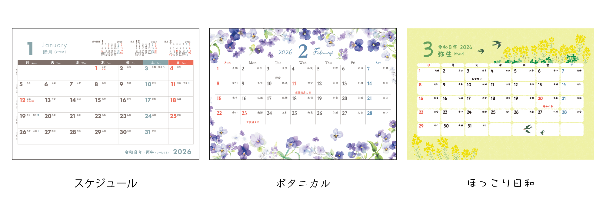 カレンダーは、壁掛け・卓上など使いやすい3サイズを展開。シンプル派にも、華やか派にもぴったりな多彩なデザインをご用意しました。